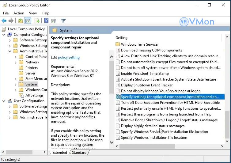 Chọn Specify settings for optional component installation and component repair.