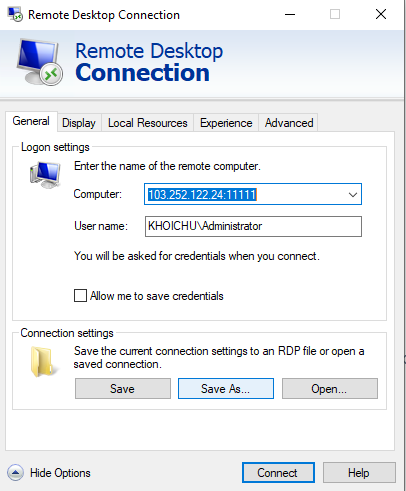 - Trong cửa sổ Remote Desktop Connection, nhập địa chỉ IP của VPS hoặc tên máy chủ.