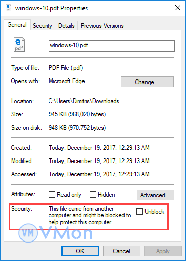 - Để kiểm tra quyền, nhấp chuột phải vào tệp RDP và chọn Properties. Trong tab General, nếu có nút Unblock, hãy nhấn vào đó.