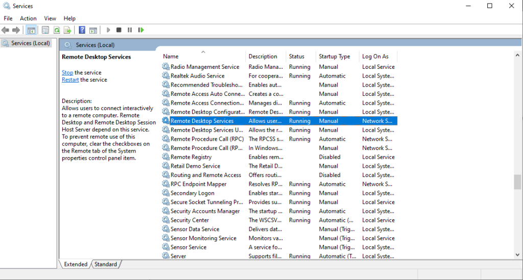 Đảm bảo rằng các dịch vụ Remote Desktop đang chạy. Bạn có thể kiểm tra bằng cách mở Services trên VPS và tìm dịch vụ Remote Desktop Services.