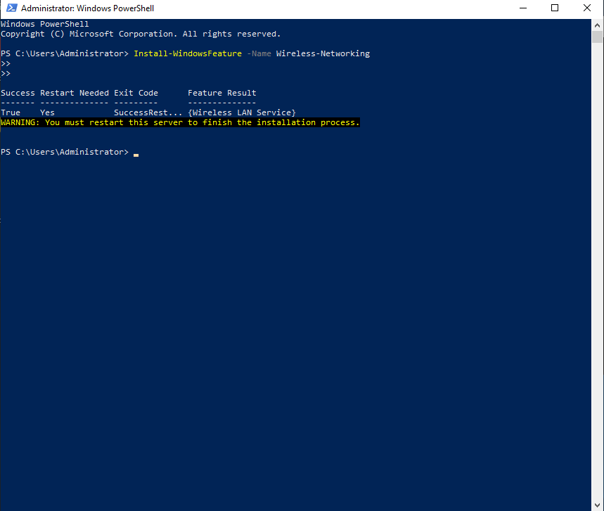 Chạy lệnh:Install-WindowsFeature -Name Wireless-Networking