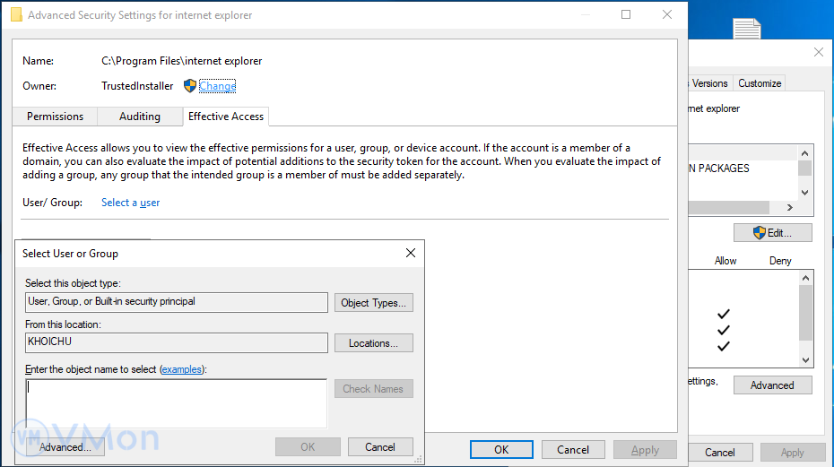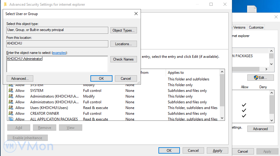1. Nhập tên tài khoản hiện tại hoặc Administrators và nhấn OK.