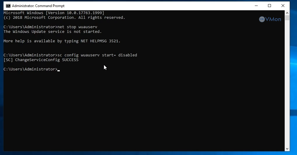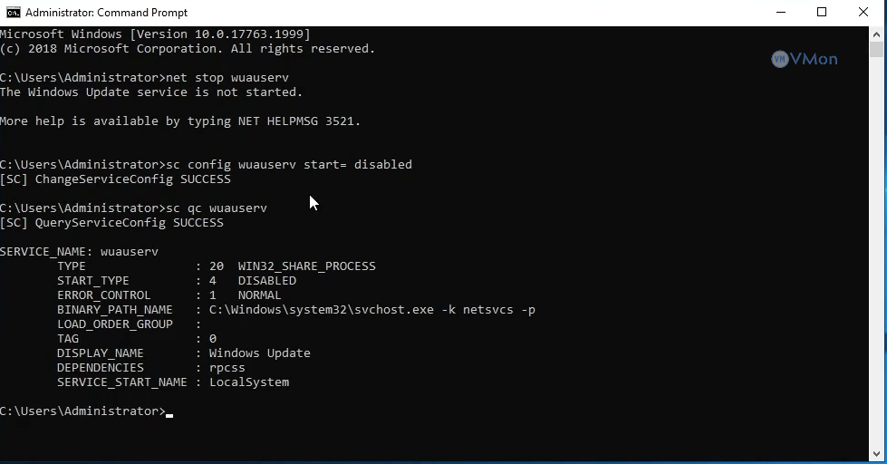 Tắt tự động khởi động dịch vụ Windows Update: Gõ lệnh tiếp theo để vô hiệu hóa tự động khởi động lại dịch vụ: