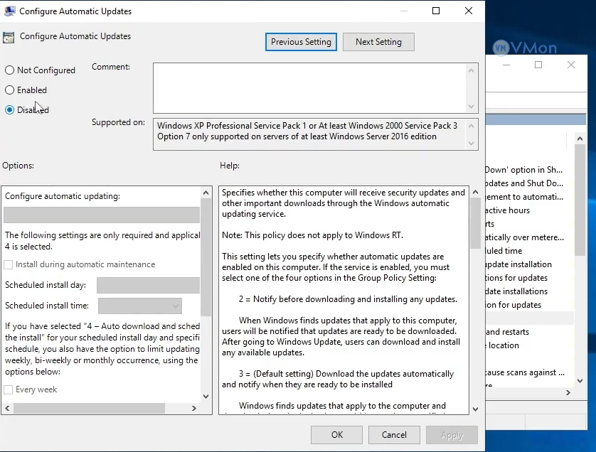- Trong cửa sổ cấu hình, chọn Disabled để tắt hoàn toàn tính năng cập nhật tự động.