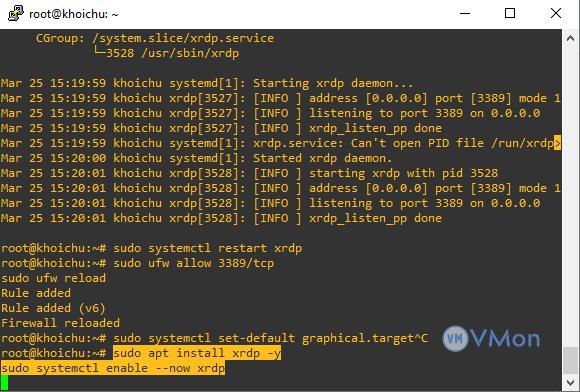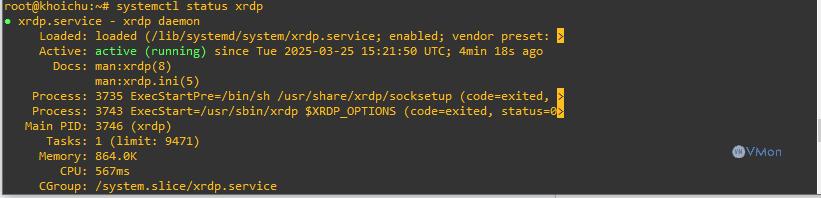 Sau khi cài đặt, kiểm tra xem xrdp có đang chạy không:
