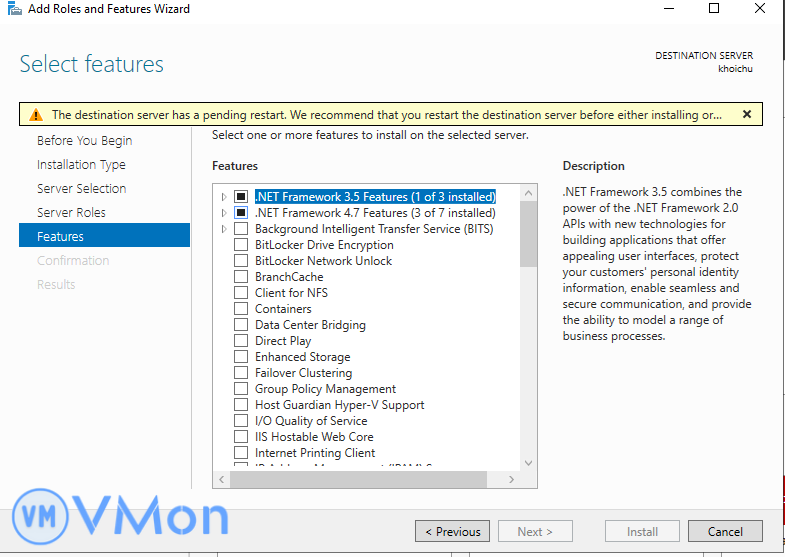 - Next các bước thông thường và chọn mặc định đến tab Features – > Chọn .NET Framework 3.5: Trong phần Features, tìm và tích chọn .NET Framework 3.5 Features.