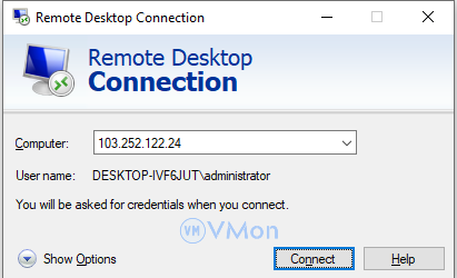 - Connect đến Windows Server 2019 bằng Remote Desktop Connection bằng tài khoản