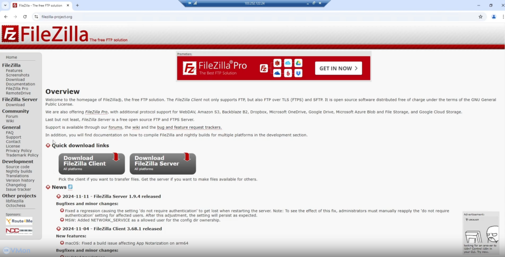 Truy cập trang chính thức của FileZilla để tải phiên bản mới nhất: FileZilla Server.