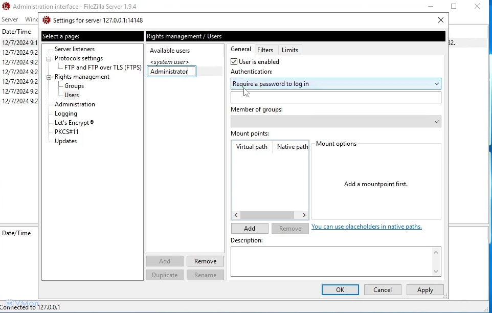 Bước 3: Cấu hình cơ bản cho FileZilla Server