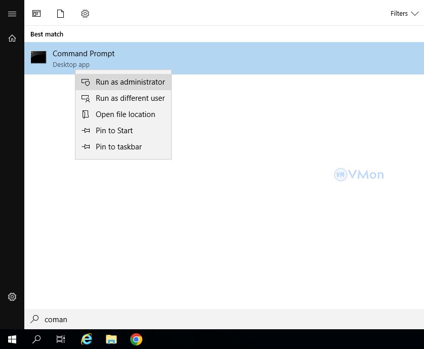 • Nhấn Start, gõ “cmd”, nhấp chuột phải vào Command Prompt, chọn Run as Administrator.